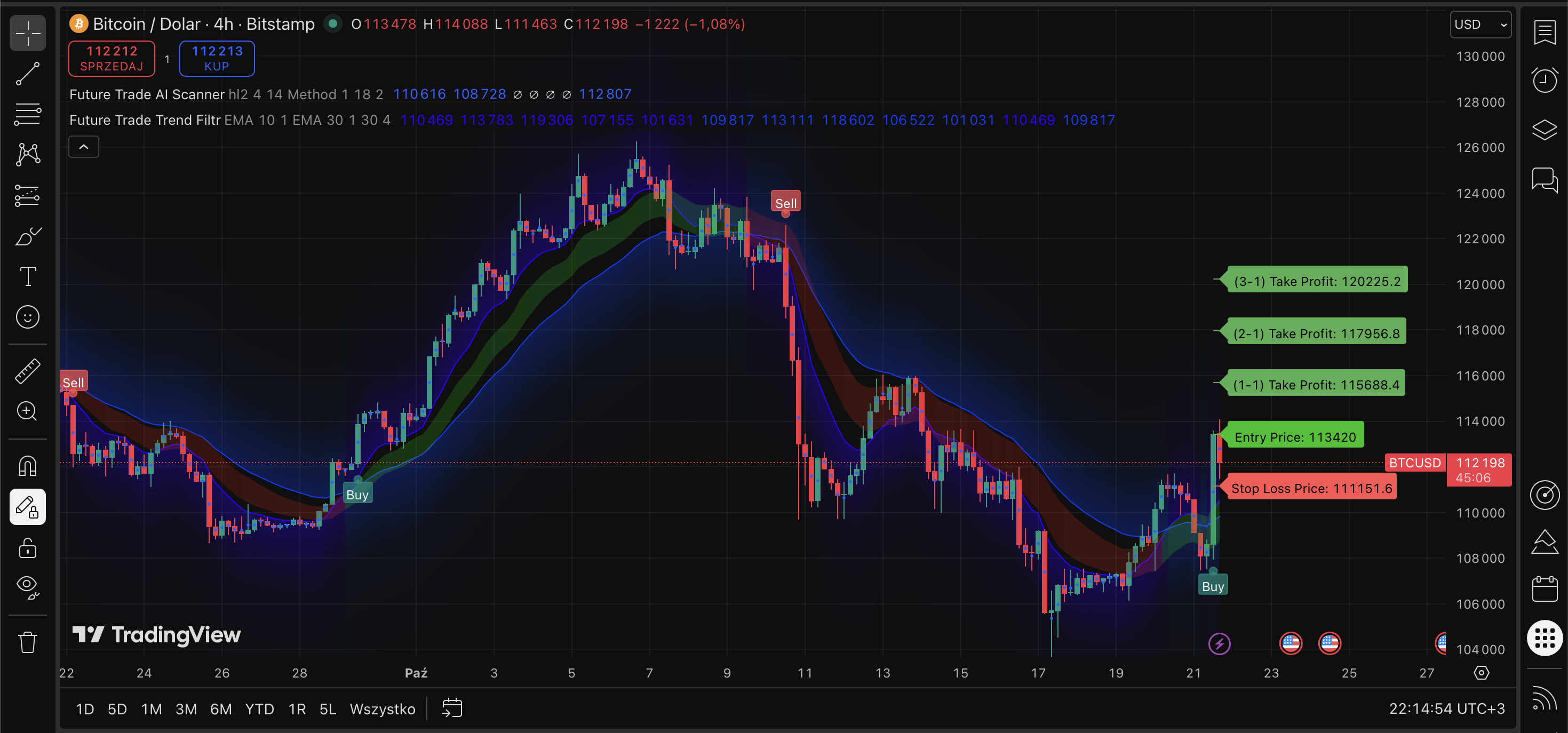 Tym wszystkim zajmuje się SKANER i jest on na wykresie widoczny jako zielone i czerwone napisy BUY Sell , Entry Price (czyli poziom wejścia), Stop Loss , Take Profit i czerwone i zielone "chmurki" pomiędzy sygnałami wejść.